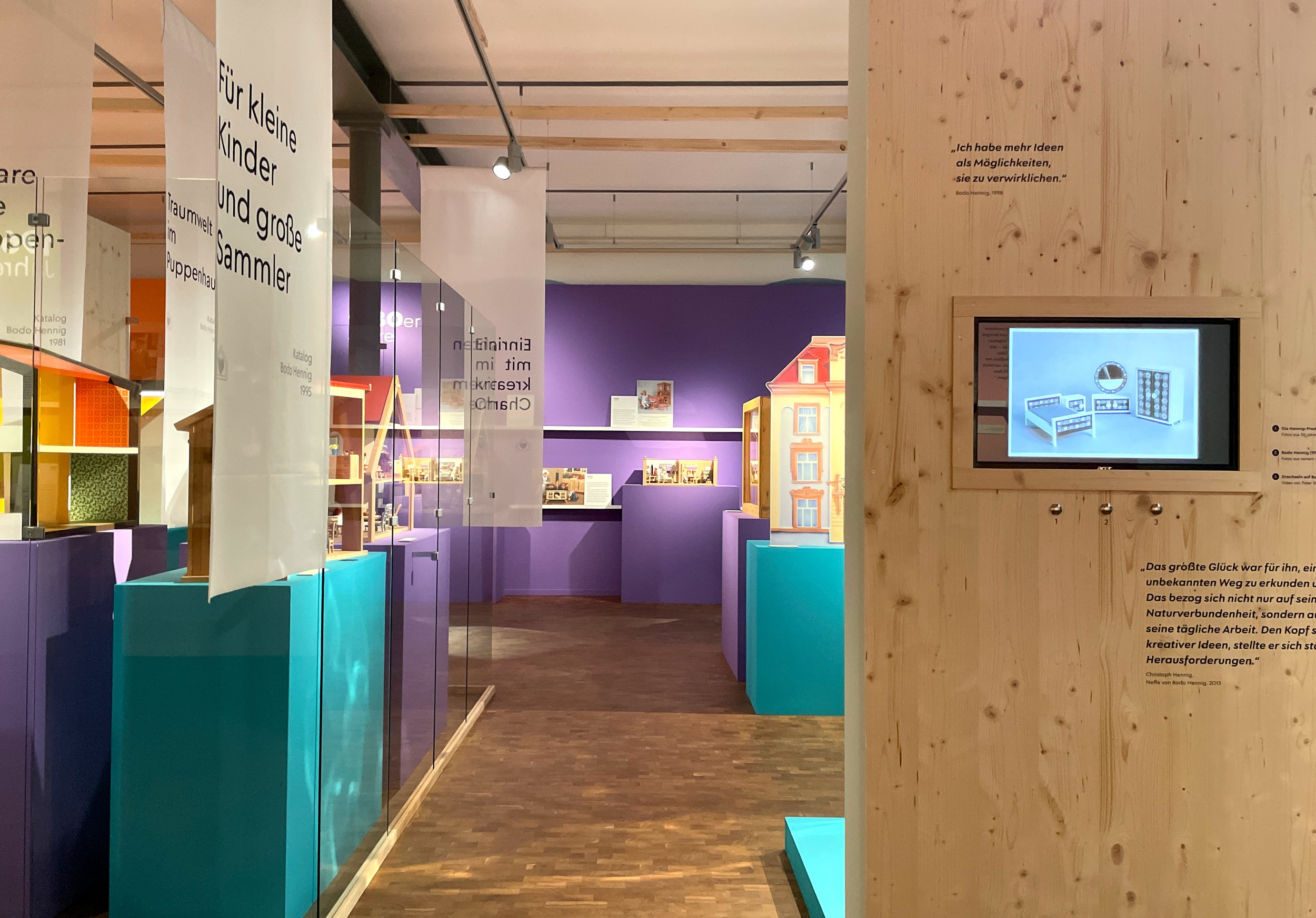 In diesen Schauräumen werden Möbel als Stellvertreter zeittypischen Designs gezeigt, die sich im Kleinen auch bei Bodo Hennig wiederfinden. Seine Puppenmöbel werden zum direkten Vergleich in fensterartigen Vitrinen und Guckkästen präsentiert, die ebenfalls in die Raumcontainer eingelassen sind.